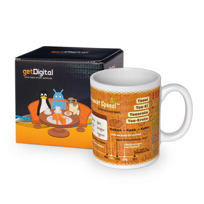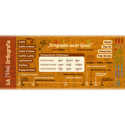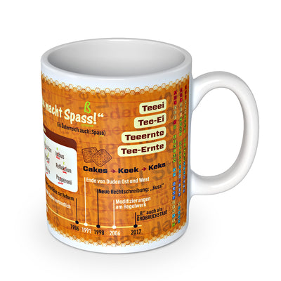 ¡Todo lo contrario! De nuevo Copa de ciencias "ortografía" ¡Ocupado, el alemán puede ser al menos tan nerd como Física, Matemáticas y CO! En esta taza de cerámica impresa en ruta, puede esperar una información fascinante sobre el idioma que la mayoría de nosotros usamos todos los días: la taza le muestra errores frecuentes (y sobre todo por qué estos errores ocurren con tanta frecuencia), le recuerda que el alemán puede ser todo. encadenado junto con un guión y también ilustra la historia de las reformas ortográficas queridas y odiadas.
