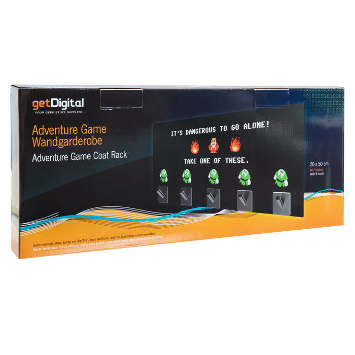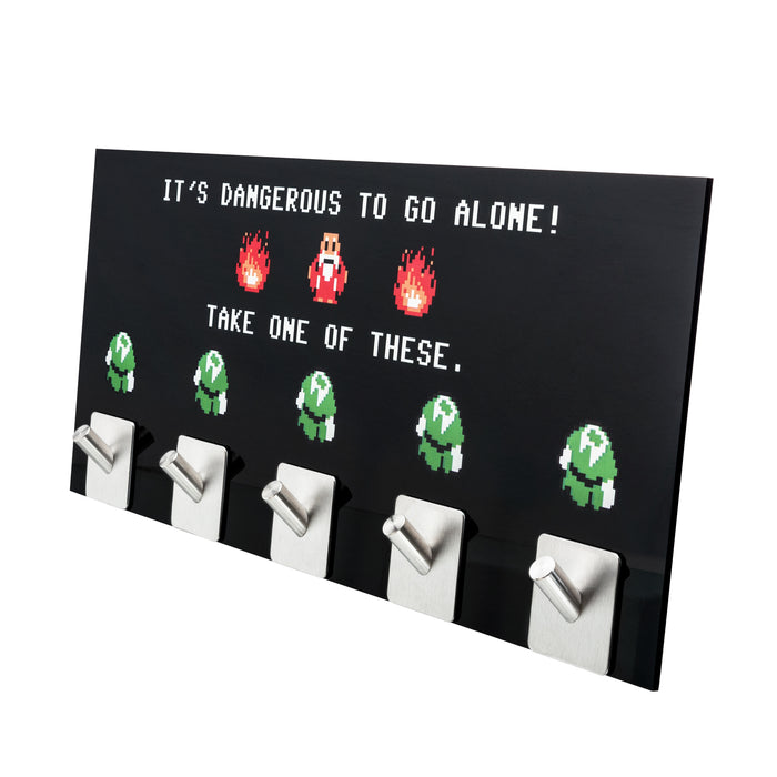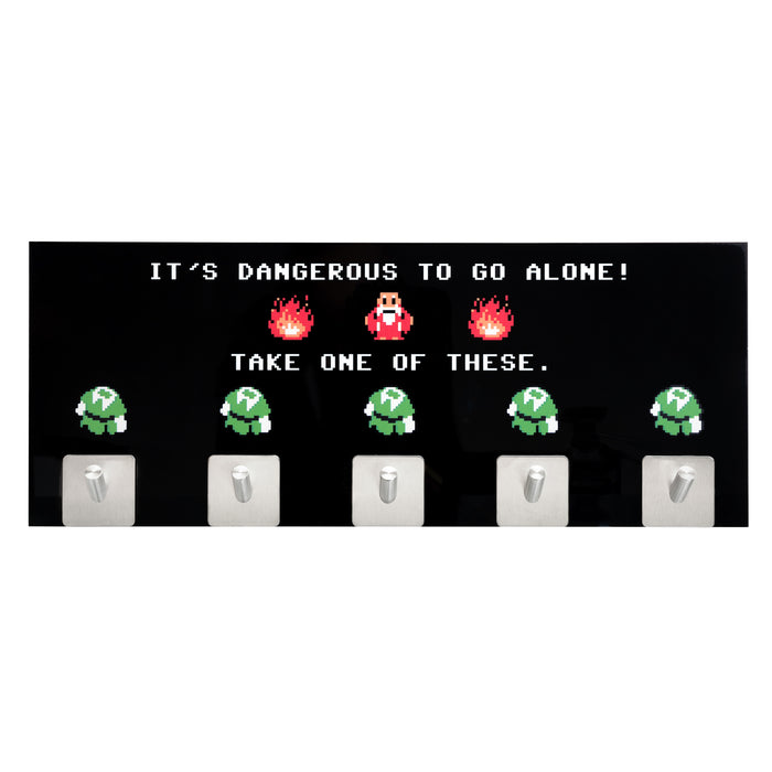 Por suerte, el perchero de pared Juego de Aventuras te recuerda que debes estar bien vestido antes de salir de casa (¡tu madre estaría orgullosa de ti!). El perchero de cristal acrílico está adornado con una imagen de un legendario videojuego en la que un sabio te advierte de los peligros de la vida cotidiana. Los cinco ganchos metálicos pueden sostener suficientes conjuntos de armadura para cada día de trabajo, y el perchero también se puede montar a prueba de bombas en la pared con tornillos o clavos (no incluidos).