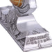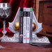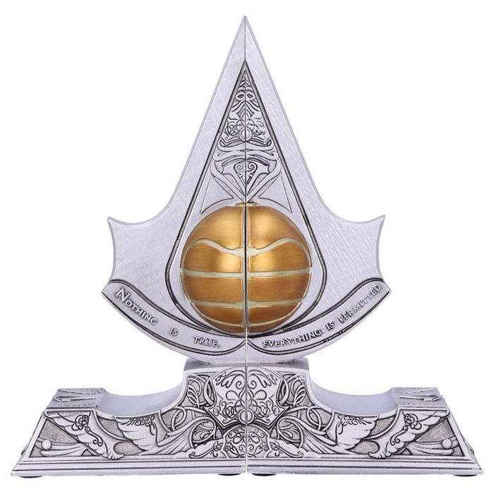 • Buchstützen in Metalloptik, in die ein goldfarbener „Edenapfel“ aus den Assassin's Creed-Spielen eingelassen ist