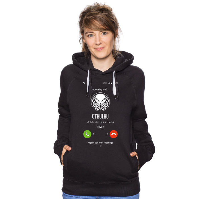 El diseño de esta original camiseta se basa en la pantalla de llamada de un teléfono móvil cualquiera, solo que el que llama es Cthulhu, con ubicación en R'lyeh y con un número de teléfono en runas. Lo demás es igual, los típicos botones de aceptar o rechazar llamada, el aviso de llamada entrante y… ¡ah!, ¡sí!, se nos olvidaba, otra cosa chula: el indicador de tiempo de la esquina superior derecha, 19:28, no está así puesto por casualidad, sino que hace referencia al año en el que se publicó el susodicho cuento de Lovecraft. ¿Qué?, ¿cómo lo ves?, ¿te atreverías a contestar esta llamada?