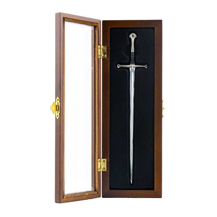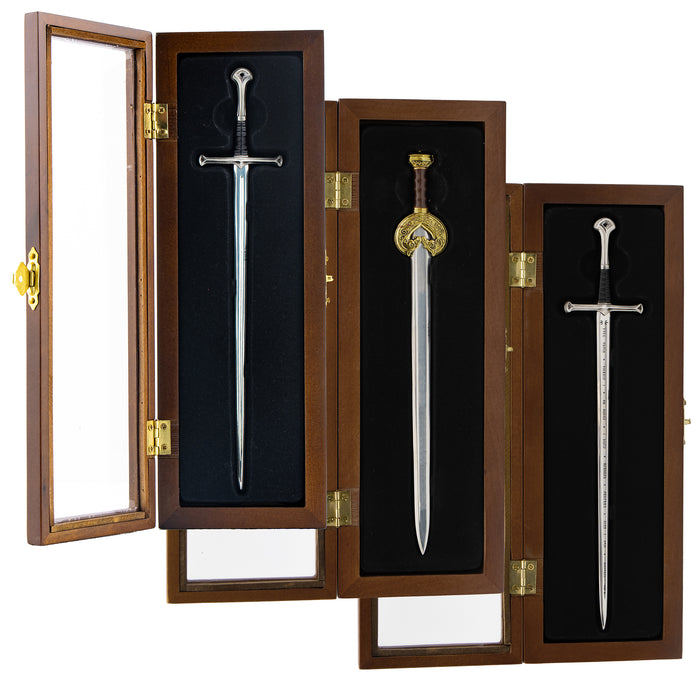 Con el abrecartas El Señor de los Anillos, este sueño puede hacerse realidad sin que te conviertas en un peligro para los que te rodean. Los abrecartas están fabricados con todo detalle en metal y vienen en una caja decorativa de madera con tapa de cristal, como corresponde a las espadas reales. Si realmente crees que las espadas son demasiado buenas para usarlas como abrecartas, puedes, por supuesto, simplemente exponerlas en tu estantería de coleccionista y admirarlas.