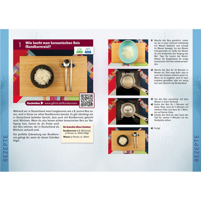 Gracias a las recetas coreanas originales simplificadas de Dschihä, en realidad sólo necesitas las salsas y especias de la caja Dosirak para conseguir el sabor típico. En el libro de cocina se describe e ilustra detalladamente cómo funciona todo esto, para que incluso los principiantes puedan seguirlo fácilmente; y si no, te llevaremos de la mano paso a paso en los vídeos a los que puedes acceder mediante códigos QR. También puedes encontrar todos estos vídeos aquí en nuestro canal de YouTube.
