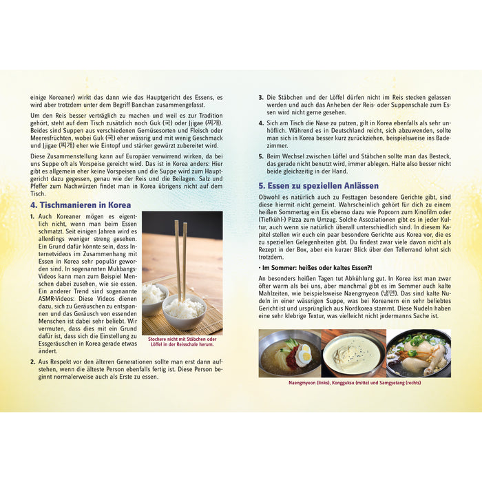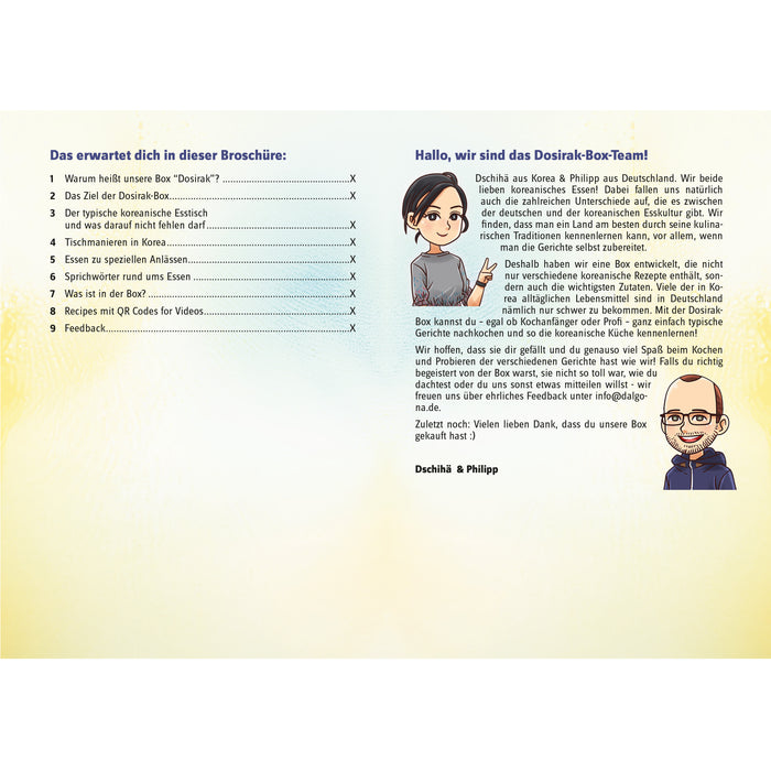 Ya sea Japchae, Budae Jjigae o Bibimbap, ¡con la caja Dosirak podrás cocinar fácilmente estos y otros 22 platos en casa! En la caja encontrarás un libro de cocina de 100 páginas (!) creado por Dschihä, la esposa coreana de nuestro chef. Contiene 25 recetas y apasionante información de fondo sobre la cultura alimentaria de Corea y cada uno de los platos.