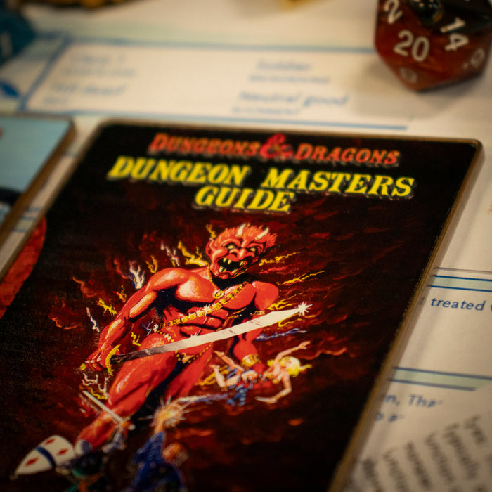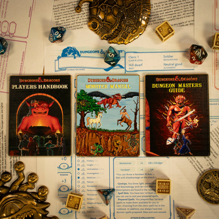 Las barras muestran las portadas de las tres obras estándar de D&D de la primera edición de 1974: el "Manual del Jugador", el "Manual de Monstruos" y la "Guía del Dungeon Master", con los icónicos diseños de Dave Sutherland y Dave Trampiers. Cada una de las barras de metal tiene un acabado de alta calidad y está realzada con esmalte de color. El juego está limitado a 1974 piezas en todo el mundo y viene en una caja expositora numerada individualmente en la que se pueden presentar adecuadamente los pequeños tesoros.