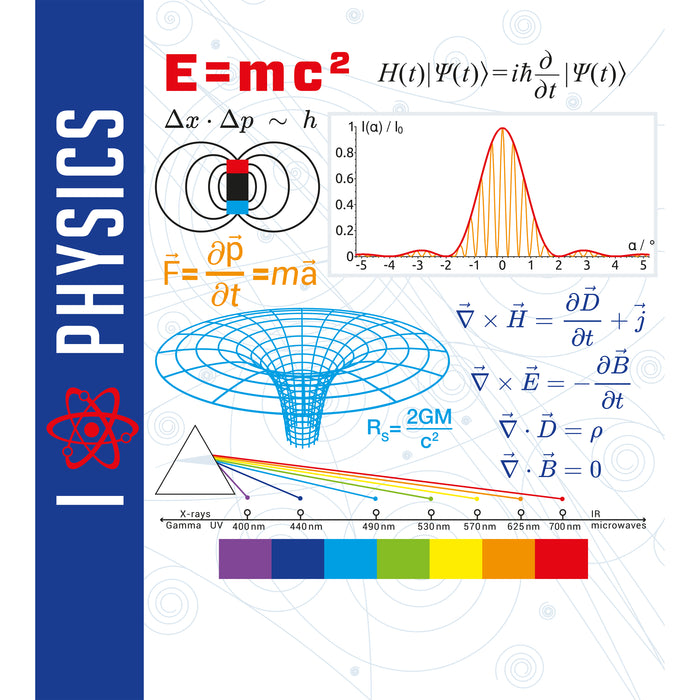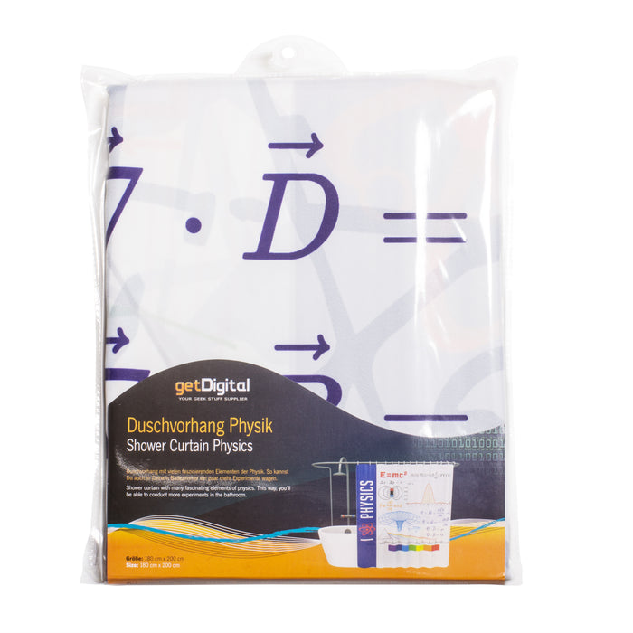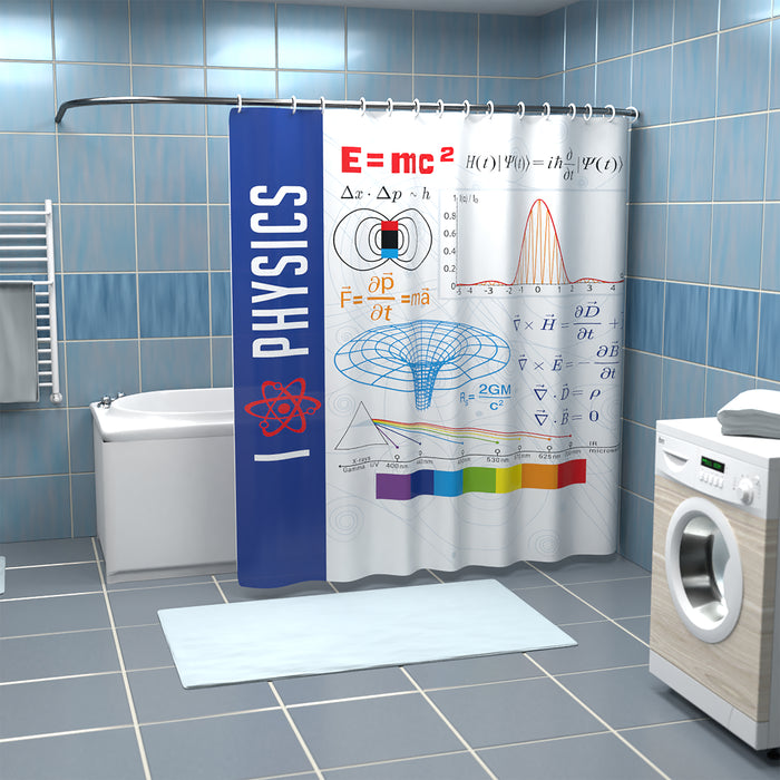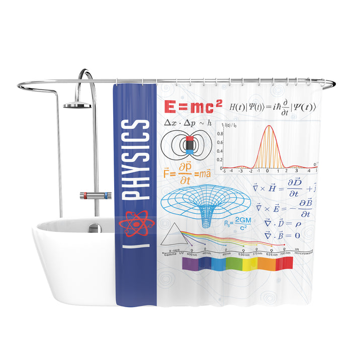 Para todos aquellos que quieran saber exactamente qué se ve en la cortina de la ducha: Escala de longitudes de onda de la luz visible (limitada por la luz ultravioleta y la infrarroja), diagrama esquemático de un prisma, ecuación de Schrödinger, gráfico del experimento de la doble rendija, principio de incertidumbre de Heisenberg, ecuación de Einstein para la equivalencia de masa y energía (E = mc²), Representación esquemática de las líneas del campo magnético de una barra magnética, radio de Schwarzschild, ecuación del movimiento de Newton, ecuaciones de Maxwell, resultado de un experimento con una cámara nebulosa (al fondo), modelo atómico de Bohr (como AMOR en "I love Physics")