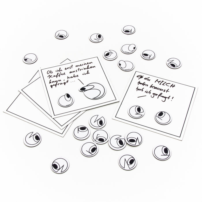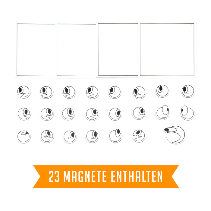 Este juego de imanes de nevera contiene 23 personajillos con diferentes expresiones faciales, así como 4 pizarras magnéticas regrabables. Puedes combinar las pizarras en un cómic de cuatro partes y escribir en ellas tus propios diálogos con un rotulador no resistente al agua (no incluido). Ya sea para desahogarte, recordar a tu compañero de piso que traiga la leche o contar un chiste: ¡Tus propias historietas Erzaehlmirnix están al alcance de la mano con estos imanes de nevera!