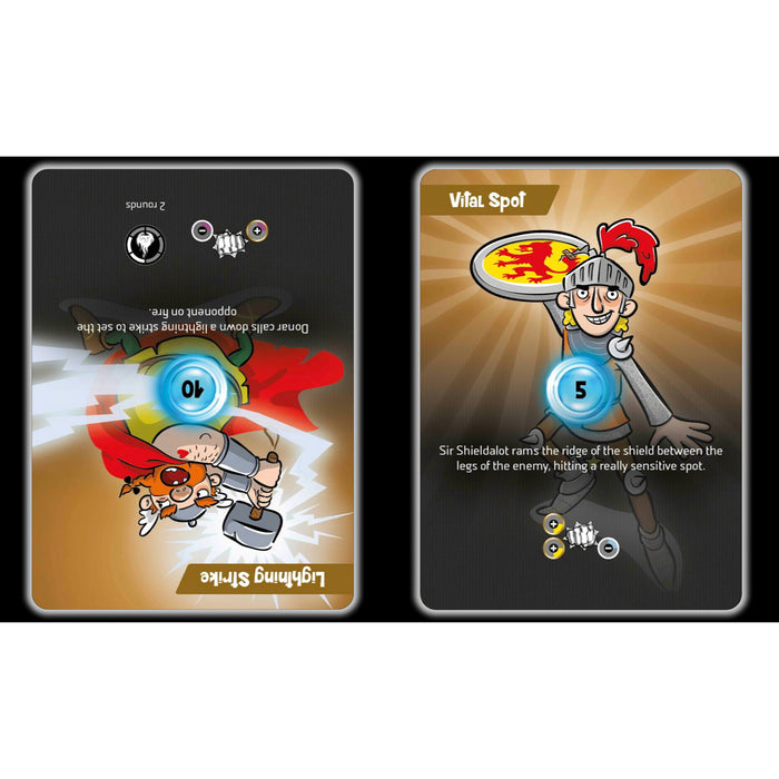 Contenido: 2 tableros de juego, 2 cartas de héroe, 12 cartas de acción, instrucciones, guía de estrategia, caja metálica
