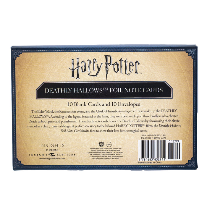 Cada juego contiene 10 cartas de felicitación del motivo respectivo, así como 10 sobres a juego. Los tamaños de las variantes también difieren. Los motivos de Gryffindor, Slytherin y Las Reliquias de la Muerte son ligeramente más pequeños que las postales normales, mientras que los motivos de Ravenclaw y Hufflepuff están impresos en postales en miniatura.