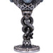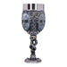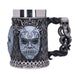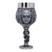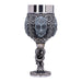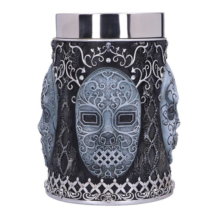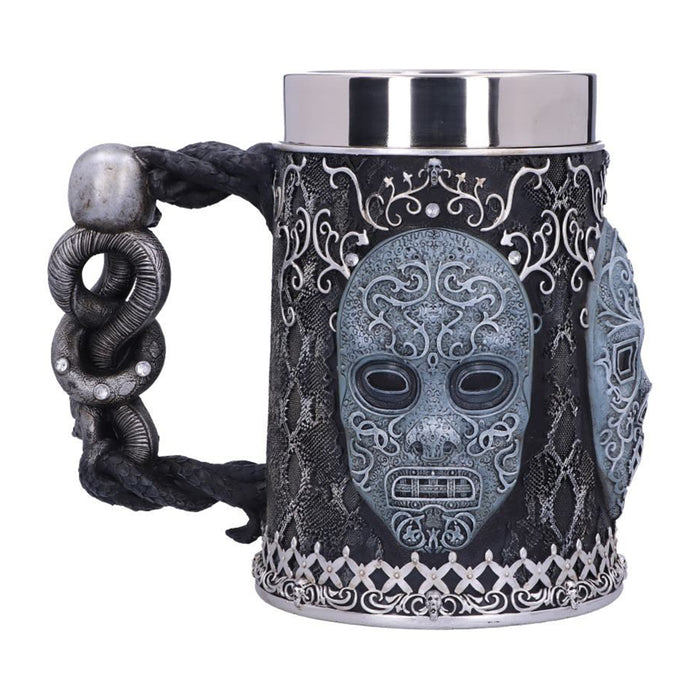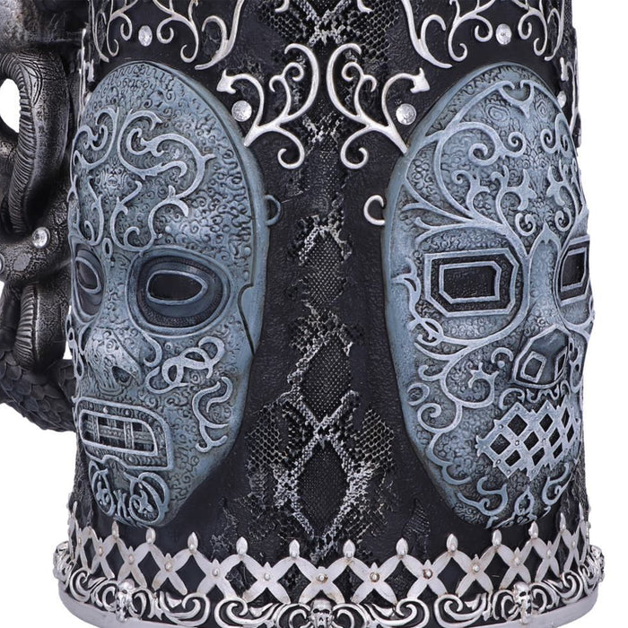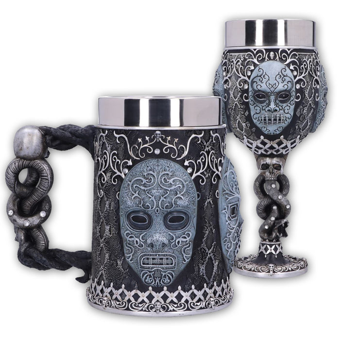 Impresiona al Señor Tenebroso en la próxima reunión con tu elegante jarra de cerveza pintada a mano o tu copa de vino con la característica máscara de Mortífago de las películas de Harry Potter. Ambos vasos están decorados con otros símbolos del oscuro mundo de los mortífagos: El tallo de la copa de vino y el asa de la jarra de cerveza siguen el modelo de la Marca Tenebrosa, y ambos recipientes están decorados con pequeñas calaveras, motivos de piel de serpiente y detalles similares. El inserto de acero inoxidable se puede quitar para limpiarlo.