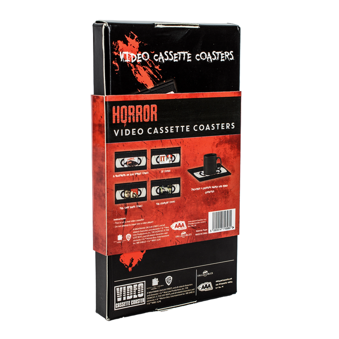 Este conjunto contiene 4 posavasos de corcho al estilo de las cintas de vídeo de las películas de terror de culto IT, Pesadilla en Elm Street, Los niños perdidos y El exorcista. Por desgracia, no se pueden reproducir en una grabadora VHS.
