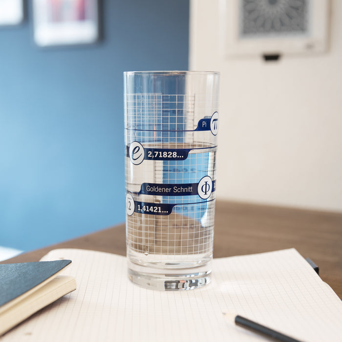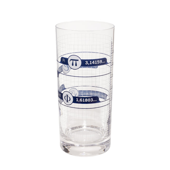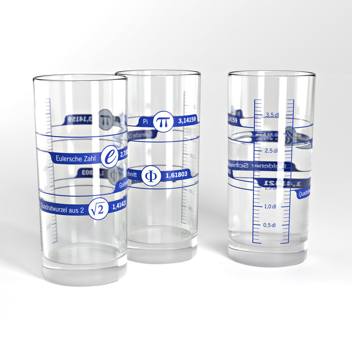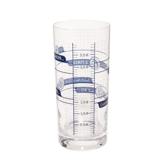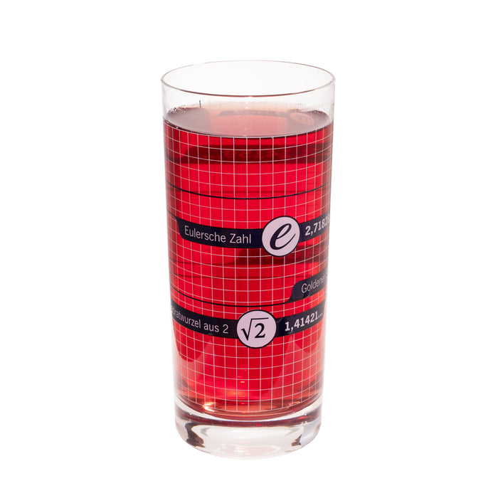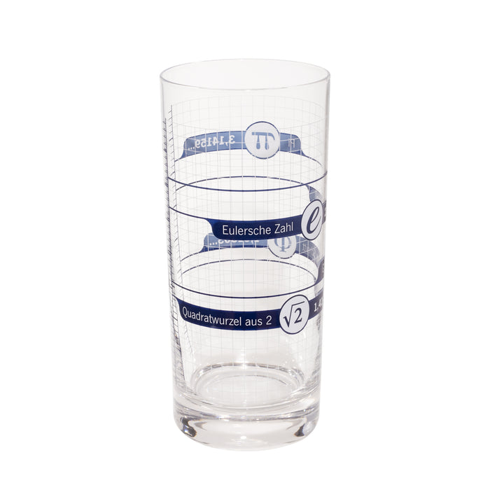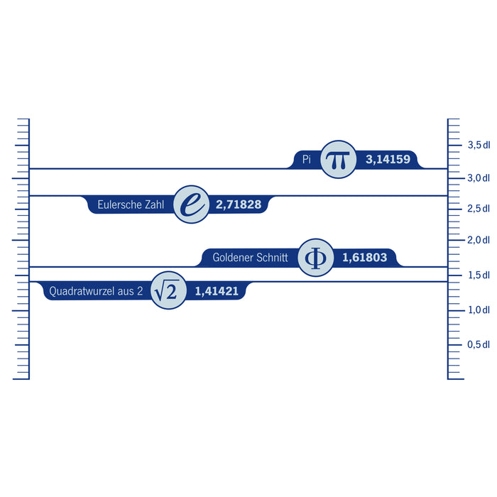 El vaso para beber números irracionales está provisto de una escala en decilitros y también rinde homenaje a cuatro números irracionales de las matemáticas. Por ejemplo, pronto podrás celebrar los logros de las matemáticas con aprox. 1,41421 (número de Euler) dl de whisky o aprox. 3,14159 (Pi) dl de limonada. La información del vaso incluye el símbolo, el nombre y la notación decimal con 5 decimales de cada número irracional.