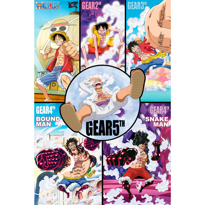 • Póster de "One Piece" que muestra el desarrollo de los poderes de Ruffy a lo largo de la serie