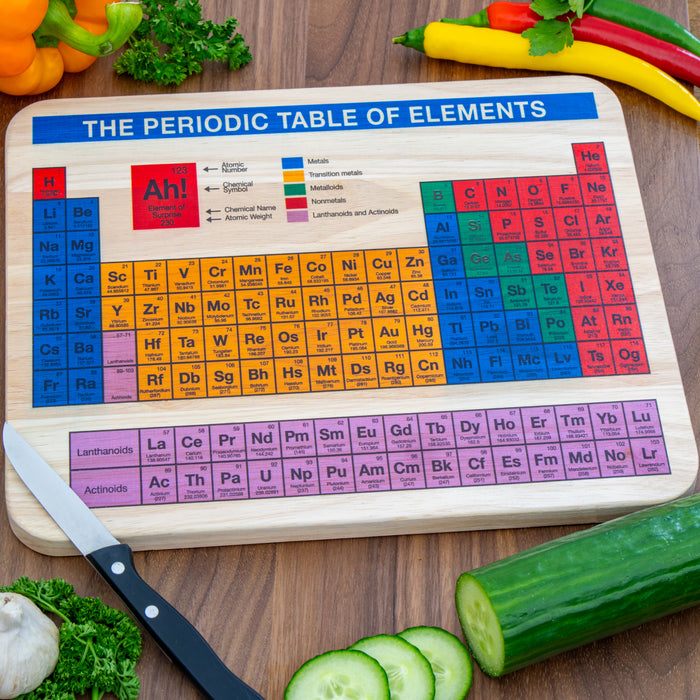 Preguntas y más preguntas. Al menos obtendrás algunas respuestas a partir de ahora con la tabla periódica. Siempre tendrás una visión clara de todos los elementos químicos importantes mientras picas los ingredientes de tu próximo plato. Por supuesto, en esta tabla también están impresos todos los componentes de una tabla periódica, incluidos los símbolos químicos y los números atómicos.