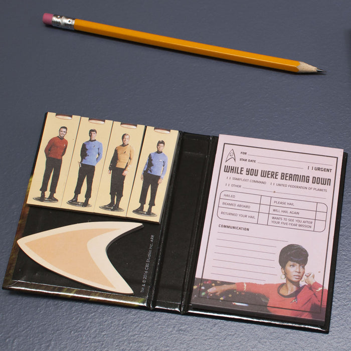 Comandante, ¡tiene que ir a una misión terrestre increíblemente importante ahora mismo! Por desgracia, nuestros sistemas de comunicación no funcionan. Así que no puedes dejar un audiologo con instrucciones... ya sabes... por si no vuelves. En su lugar, ¿por qué no coges una de las notas adhesivas de Star Trek TOS?