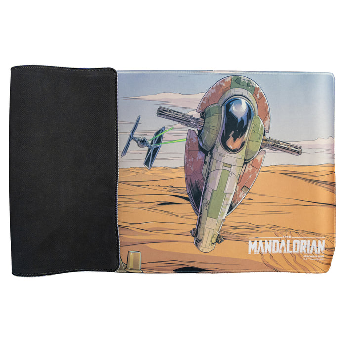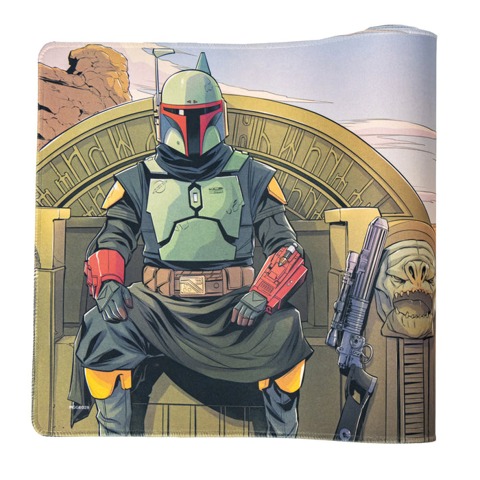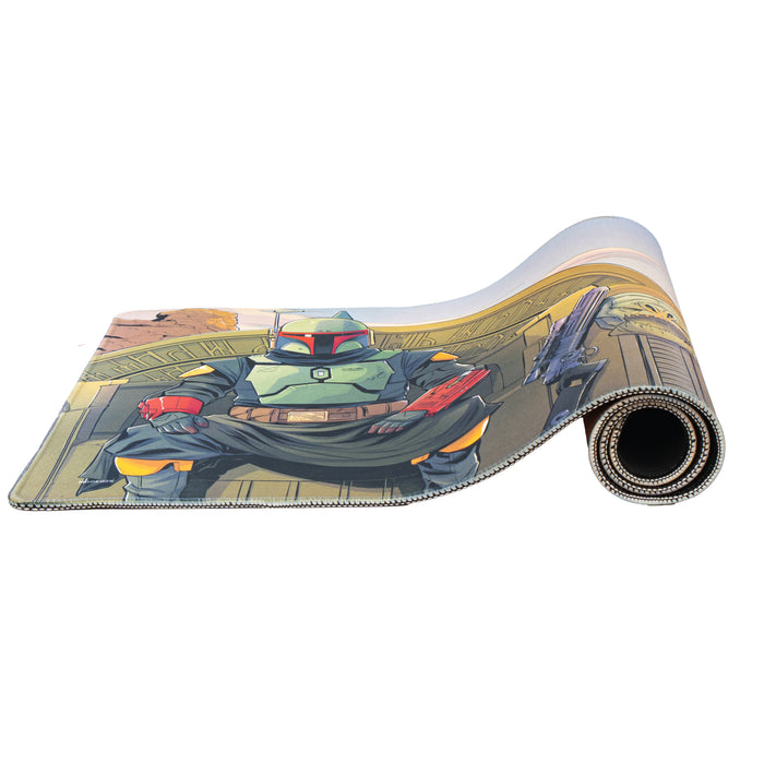 Da ist es nur logisch, dass einer der gefürchtetsten Kopfgeldjäger der Galaxis auf dieser Mousemat zu sehen ist, schließlich ist Boba Fett bekannt dafür, seinen Blaster besonders schnell zu zücken. Und weil dieses Mousepad extra breit ist, hat auch noch sein Schiff, die Slave I, Platz darauf gefunden.