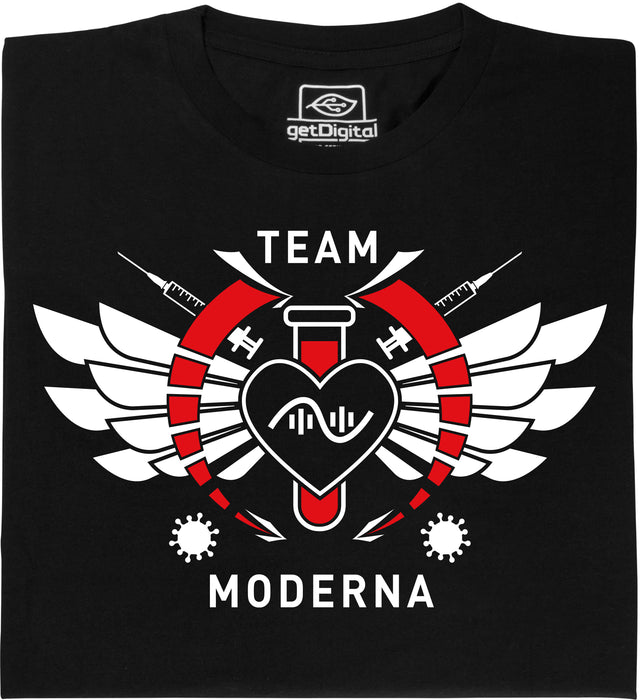 ¿De qué equipo eres tú?, ¿del BioNTech Pfizer, el Moderna, el AstraZeneca o el Johnson & Johnson? ¿Del Moderna? Pues que sepas que la vacuna de Moderna, al igual que la de Pfizer, ha sido desarrollada con la ayuda de la tecnología del ARN mensajero y que debe ser almacenada a -20 ºC. Además, entre la primera y la segunda dosis deben transcurrir, como mínimo, 24 días. Todo un orgullo estar en este equipo, ¿a que sí? Pues demuéstralo poniéndote su camiseta, lleva un dibujo que representa el logotipo de la empresa, ARN, unos pocos coronavirus y dos jeringuillas (por las dos dosis necesarias). ¿Guay verdad? Pues hazte con ella y ¡a concienciar a los demás!