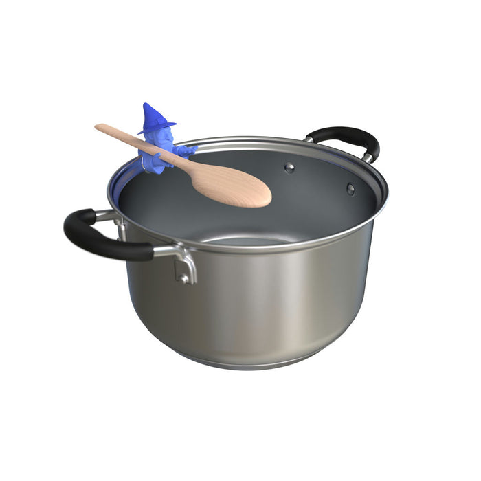 El pequeño mago de silicona se coloca simplemente en el borde de la olla y crea un pequeño hueco entre la olla y la tapa para que el vapor pueda salir fácilmente. También estira los brazos para sujetar la cuchara de madera mientras reduces la salsa o la sopa. De este modo, evitas otro lío que suele producirse cuando quieres acercar la cuchara de madera que gotea a la olla después de remover.